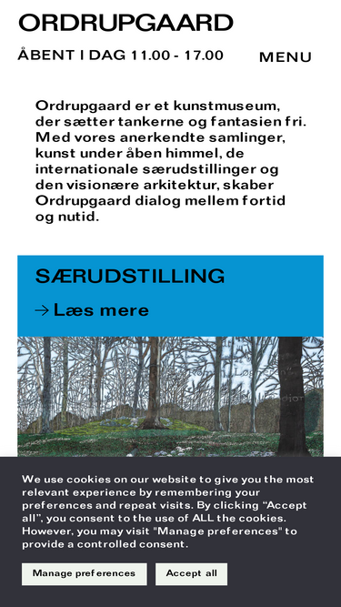 Guided tours. Ordrupgaard offers a wide range of guided tours for companies and private groups. Here, you can read more about our various guided tours. Private tours. At Ordrupgaard you can book your own private tour for a group of guests and get a special introduction to the museum, the collection and the temporary exhibition. We offer tours in Danish, English and French.Each tour lasts 45-60 minutes. There is no minimum number of participants. We gladly to do guided tours for individuals, as well as for groups of up to 25 people.The tours can serve as inspiring features in connection with e.g. birthdays, dates, family outings, workplace events or professional and social clubs. Combine your tour with a meal in café Chaya, where you can enjoy tasty food overlooking Ordrupgaard's beautiful park with site-specific works of art.