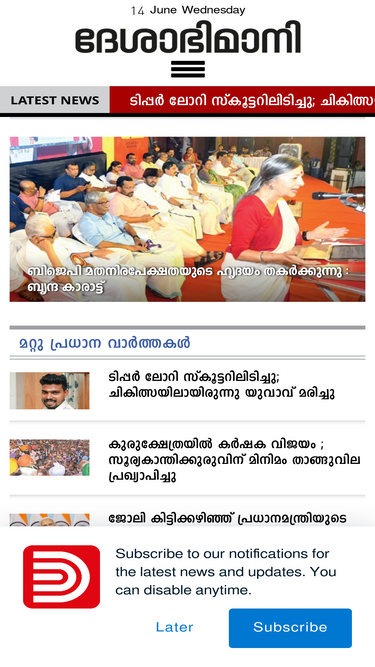 Malayalam News (മലയാളം വാർത്തകൾ) from Deshabhimani News. Recent Malayalam News, breaking news in Kerala, Brings You Latest Malayalam News, New News Malayalam, Political News Kerala, Weather, Sports, Entertainment, LifeStyle. Deshabhimani Latest News Include News Today Malayalam, Malayalam News Latest, Malayalam News Paper Today, Malayalam News App, E-Paper