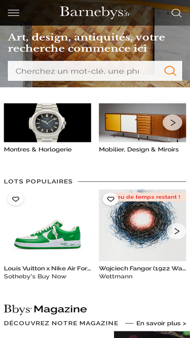 100%Découvrez toutes les ventes aux enchères en ligne et enchérissez sur des articles de luxe des plus grandes maisons de vente aux enchères au monde dans les domaines de l'art, du mobilier, des bijoux, des montres, des objets de collection, des antiquités et plus encore.