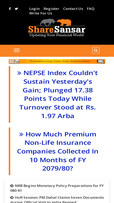 nepal leading online financial newsportal with up-to-date news, updates and information about nepse (nepal stock exchange), nepse listed companies, share market, stock market with free technical and fundamental analysis chart, nepse real time chart, and genuine trading research tools. newsportal covering complete news about nepse live market trading, floorsheet, indices, share, agm, bookclose, dividend, bonus, cash, update, mutual fund, ipo, company, banks , insurance, finance, hydro, portfolio in nepal,technical , fundamental and quantitative analysis research tools of stock market
