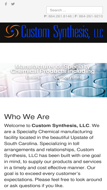 88%custom synthesis, llc, we are a specialty chemical manufacturing facility located in the beautiful upstate of south carolina. specializing in toll arrangements and relationships, custom synthesis, llc has been built with one goal in mind, to supply our products and services in a timely and cost effective manner. our goal is to exceed every customer’s expectations.