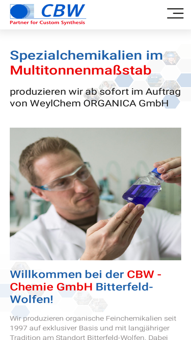 87%Spezialchemikalien im Multitonnenmaßstab produzieren wir ab sofort im Auftrag von WeylChem ORGANICA GmbH Willkommen bei der CBW – Chemie GmbH Bitterfeld-Wolfen! Wir produzieren organische Feinchemikalien seit 1997 auf exklusiver Basis und mit langjähriger Tradition am Standort Bitterfeld-Wolfen. Dabei überführen wir Ihr Produkt von der Syntheseformel über die Laborstudie in die Produktion und liefern zuverlässig und […]