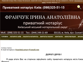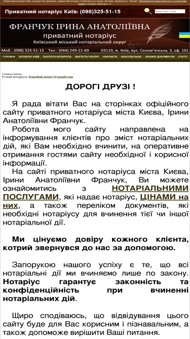 приватний нотаріус франчук ірина анатоліївна пропонує кваліфіковане надання нотаріальних послуг згідно діючого законодавства україни. на нашому сайті ви можете ознайомитись з нотаріальними послугами, що надаються нотаріусом, цінами на них, а також переліком документів, які необхідні для вчинення тієї чи іншої нотаріальної дії.