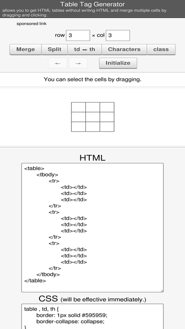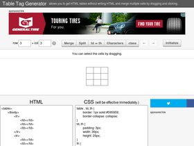 100%Tabela Tag Generator é uma ferramenta de GUI para criar a tabela HTML.Isto permite obter uma marca de tabela sem escrever HTML, mesclar as células e digite os caracteres diretamente na tabela.Você não precisa se preocupar sobre o colspan e rowspan.