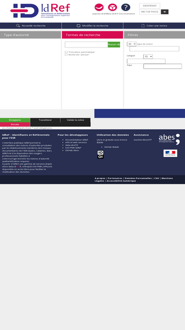 57%l’application idref permet d’interroger les autorités des bases calames, sudoc, star, step et thèses.fr, d'enrichir et/ou de corriger des notices autorités existantes, de créer, sur authentification, de nouvelles entités.