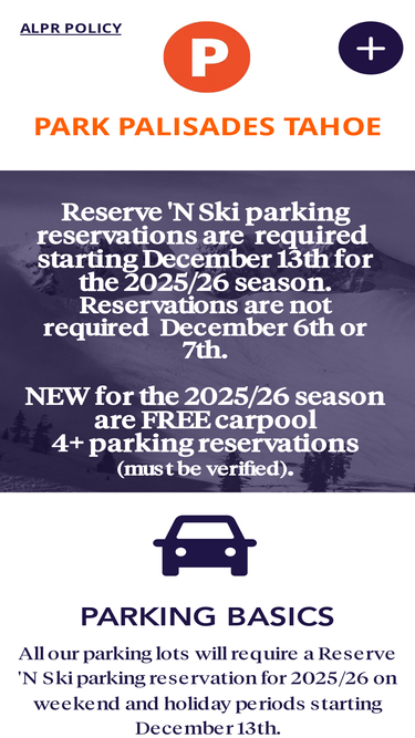 100%Park Palisades Tahoe FAQS. Frequently Asked Questions about the new parking program and Reserve N Ski parking reservations for Palisades Tahoe ski resort in California.