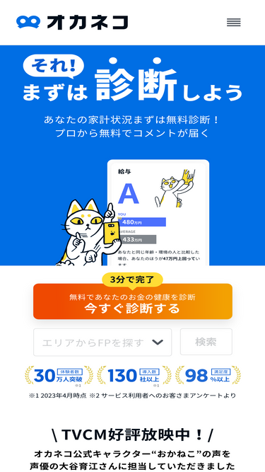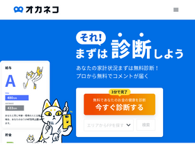 累計ユーザー数120万人突破/オカネコは、国内最大級の家計診断・相談サービス。サービス利用の満足度98%以上。お金のことならすべてオカネコにお任せ。TVCMも好評放映中!