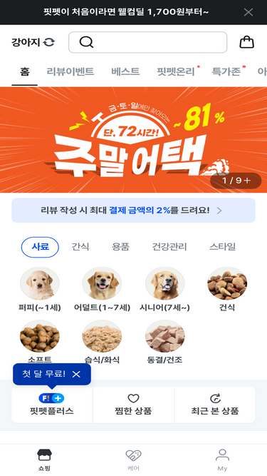 76%반려동물 전문 큐레이션 서비스와 펫케어 라이프 매니저 상담, 실시간 최저가 쇼핑, 24시간 새벽 배송, 첫 구매 회원 5,000원 할인까지!