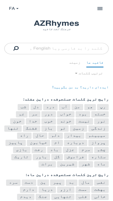 77%فرهنگ لغت قافیه برای نوشتن اشعار ، رپ و شعر. فقط کافیست که یک کلمه یا عبارت را واردکنید تا قافیه ی مورد نظرتان را پیدا کنید.