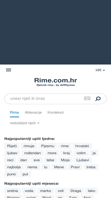 rječnik za rime. traženje riječi za tekstopisaca i pjesnike. možeš tražiti rime za riječi (npr. jabuka), za završnice (npr. ka), i za izraze (npr. crvena jabuka).