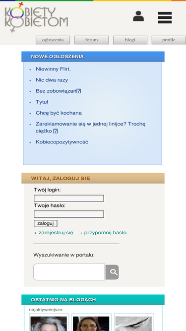 jestes lesbijka? zapraszamy ciebie do kobiety kobietom. znajdziesz tu inne lesbijki, pomoc i azyl. pogadaj na czat i forum, czytaj i dodaj ogłoszenia towarzyskie. kobiety kobietom to tysiące arykulow i komentarzy napisanych przez lesbijki, galerie, opowiadania, wiersze, konkursy.