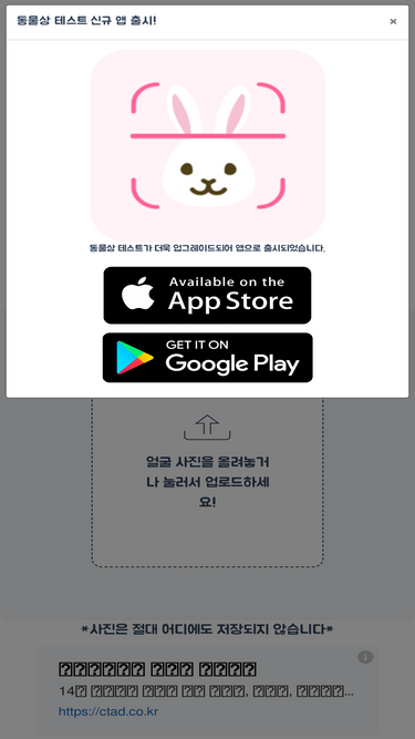 얼굴로 보는 인공지능 동물상 테스트, 나와 닮은 동물상을 찾아보세요! 대표 동물상 연예인 사진 데이터로 학습한 인공지능이 나의 얼굴로 동물상과 특징을 찾아드립니다. 회원가입도 필요없이 화면에서 바로 확인해보세요! 사진 데이터는 그 어디에도 전송되지 않습니다. 인공지능이 보는 나의 동물상 테스트 한번 해보세요! 강아지상? 고양이상? 여우상? 사슴상? 토끼상? 곰상? 공룡상? 당신의 동물관상테스트를 해보고 얼굴상 테스트를 통해 나와 닮은 동물 찾기를 할 수 있습니다.