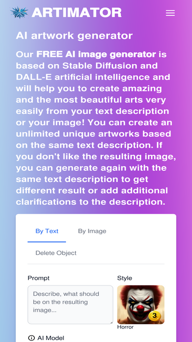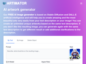 75%Artimator is a FREE AI art generator to create unique images from text descriptions in different styles. Try all AI-powered features of our free AI image generator.