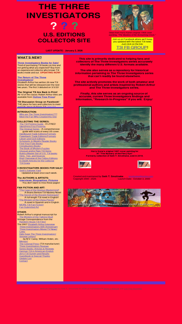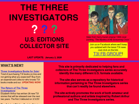 100%this three investigators site is dedicated to helping fans and collectors accurately identify the many different u.s. three investigators formats in existence and also serves as a repository for any historical information pertaining to the three investigators series that can not be found on other sites. robert arthur, william arden, dennis lynds, m.v. carey, nick west, kin platt, and marc brandel relate the mystery adventures of jupiter jones, bob andrews, and pete crenshaw in rocky beach, california. alfred hitchcock introduces the earlier books. this site is dedicated to collector's of the series and those who want to relive the 3 investigators mysteries.