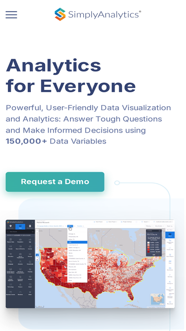75%SimplyAnalytics is a web-based mapping, analytics, and data visualization application that makes it easy for anyone to create interactive maps, charts, and reports using 150,000+ data variables.