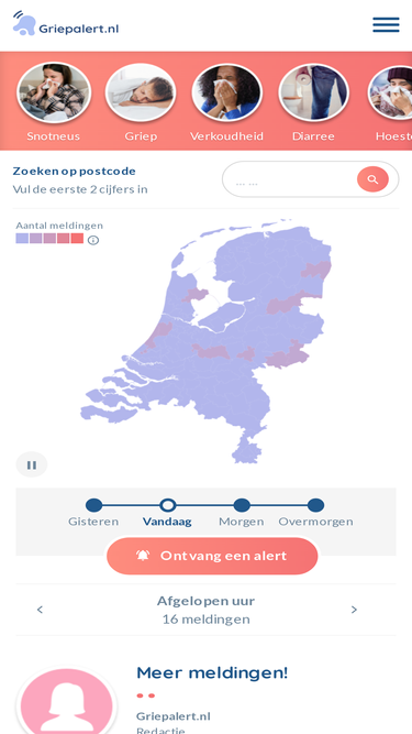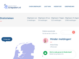 77%Op griepalert.nl volg je de griep in Nederland. De website visualiseert het aantal griepmeldingen in Nederland per tweecijferige postcode. Dankzij het geavanceerde voorspellingsmodel zijn we in staat de griep tweedagen vooruit te voorspellen.