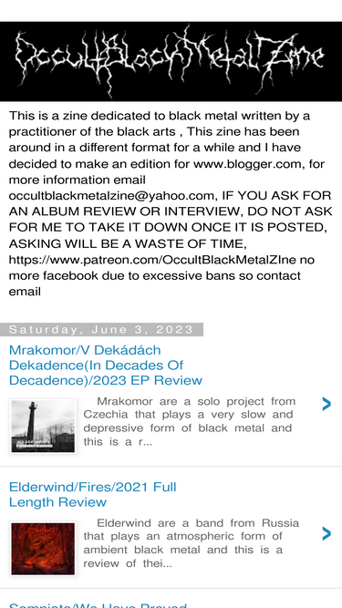 This is a zine dedicated to black metal written by a practitioner of the black arts , This zine has been around in a different format for a while and I have decided to make an edition for www.blogger.com, for more information email occultblackmetalzine@yahoo.com, IF YOU ASK FOR AN ALBUM REVIEW OR INTERVIEW, DO NOT ASK FOR ME TO TAKE IT DOWN ONCE IT IS POSTED, ASKING WILL BE A WASTE OF TIME, https://www.patreon.com/OccultBlackMetalZIne no more facebook due to excessive bans so contact email