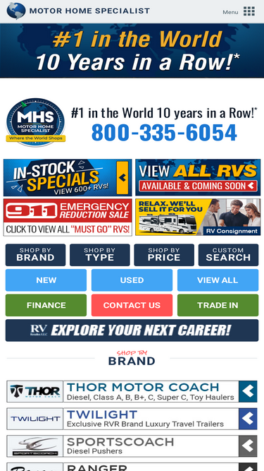 Motor Home Specialist (MHSRV) is the #1 Motorhome Dealer in the World. We carry new RVs from Coachmen, Dynamax, Entegra Coach, Forest River, and much more.