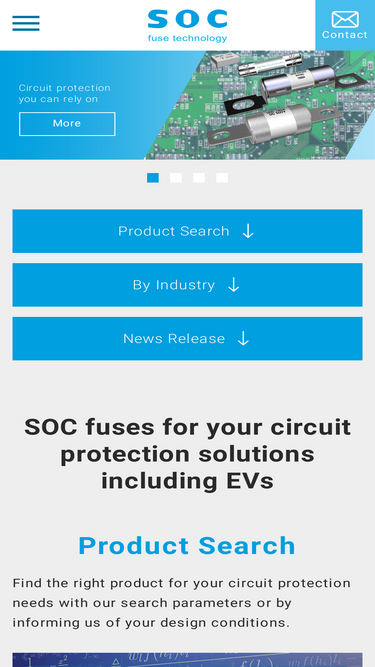 ヒューズ技術でリードするエス・オー・シー(SOC)株式会社は、EV用、家電用、医療機器用、車載エレクトロニクス用など多岐にわたる用途に対応できるグローバルメーカーです。チップ形からボルト締めの大電流用まで、各種のレパートリーを揃えており、ヒューズ選定サービスでも、高い評価をいただいております。