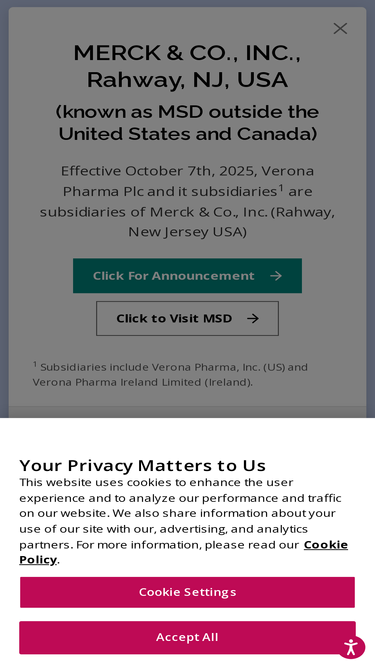 100%Posters support Ohtuvayre ® (ensifentrine) as a first-in-class selective dual inhibitor of PDE3 and PDE4 for a broad COPD population LONDON and RALEIGH, N.C., Sept. 16, 2025 (GLOBE NEWSWIRE) -- Verona Pharma plc (Nasdaq: VRNA) (“Verona” or the “Company”), a biopharmaceutical company focused on