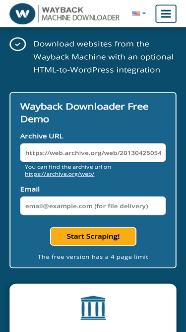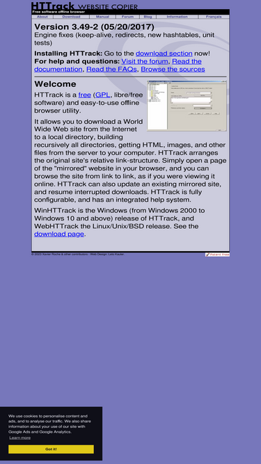 100%httrack is a free (gpl, libre/free software) and easy-to-use offline browser utility. it allows you to download a world wide web site from the internet to a local directory, building recursively all directories, getting html, images, and other files from the server to your computer. httrack arranges the original site's relative link-structure. simply open a page of the 'mirrored' website in your browser, and you can browse the site from link to link, as if you were viewing it online. httrack can also update an existing mirrored site, and resume interrupted downloads. httrack is fully configurable, and has an integrated help system. winhttrack is the windows 2000/xp/vista/seven/8 release of httrack, and webhttrack the linux/unix/bsd release.