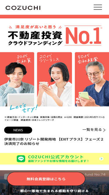 94%"City development real estate crowdfunding" COZUCHI is a middle-return crowdfunding service that allows you to invest in real estate from 10,000 yen per unit.
