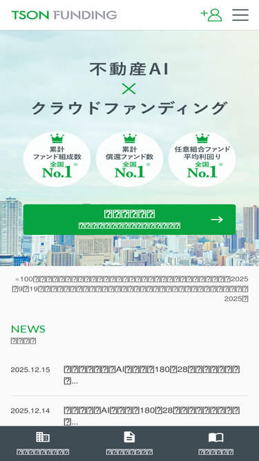 90%TSONFUNDING(ティーソンファンディング)とは、TSONが運営する不動産投資型クラウドファンディングです。 「不動産AI×クラウドファンディング」TSON独自開発の不動産AIを活用しAIが導き出した物件を運用し、その運用益や売却益を分配する短期償還型の堅実な資産運用を実現。途切れなく高利回りのファンドを組成できるスキームで月1ファンド以上のペースで途切れなく投資先となるファンドをご提供します。