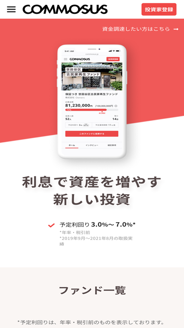 COMMOSUS(コモサス)は、金融・不動産のプロが厳選した資産に1万円から投資ができる融資型クラウドファンディングの仕組みを活用したオンラインプラットフォームです。