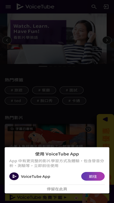 超過360萬人愛用的線上英語學習平台!上萬部YouTube影片教材,搭配中英文翻譯字幕與英漢字典,輕鬆掌握日常對話、瞭解單字的發音與用法。是最適合華人提升英文聽力和英文口說的學習方法和工具。