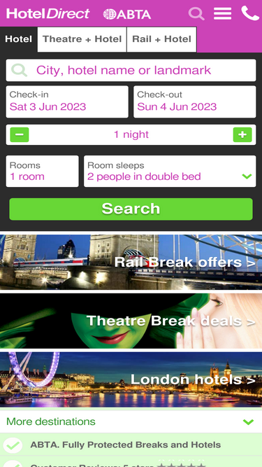 up to 75% off hotels, theatre breaks and rail breaks. fully abta protected. trustpilot 4.9/5. no booking or card fees. add train or theatre tickets to your hotel booking for special package offers. book online or call 0800 633 8000.