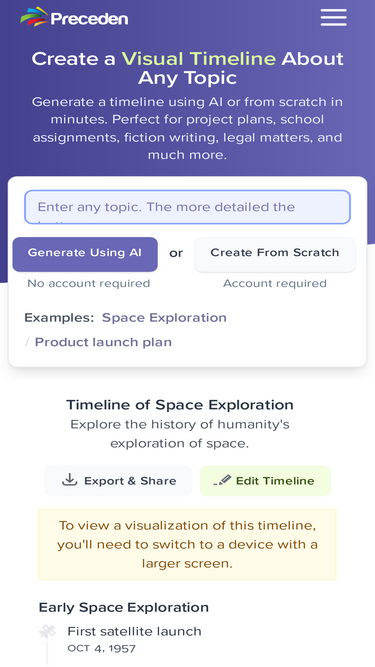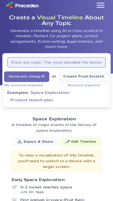 100%Generate a timeline using AI or from scratch. Perfect for project plans, school assignments, fiction writing, legal matters, and much more.