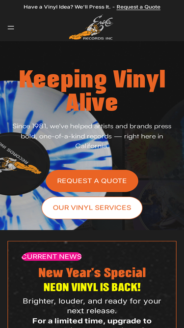 85%WELCOME TO ERIKA RECORDS. Erika Records is a vinyl record pressing plant that has over 40 years experience in the vinyl record manufacturing business.