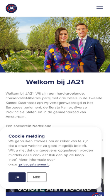 58%wij zijn een conservatief-liberale partij met een vertegenwoordiging in de tweede kamer, de eerste kamer, het europees parlement, diverse provinciale staten en waterschappen en in de gemeenteraad van amsterdam. ja21 staat voor een soeverein nederland, minder bureaucratische regeldruk uit europa, meer betaalbare woningen, een streng en humaan asielbeleid en zoveel mogelijk ruimte voor werkenden, ondernemers, zzp'ers én boeren.