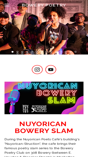 Bowery Poetry is a spoken word poetry & reading venue located at 308 Bowery NYC supporting poets, music, open mic, and other live performance arts in the heart of the East Village, New York City