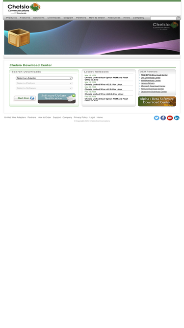 chelsio download center. software for ethernet network adapter cards, unified storage software, high performance storage gateways, unified management software, bypass cards, and other solutions focused on specialized applications.