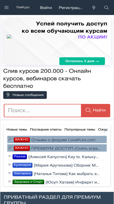 Получите бесплатный доступ к курсам, онлайн-вебинарам, тренингам, видеоурокам и книгам в формате торрент. Наш слив-форум предоставляет доступ к ценным обучающим материалам, которые помогут вам развиваться и улучшать свои навыки. Скачивайте бесплатно курсы и складчины.