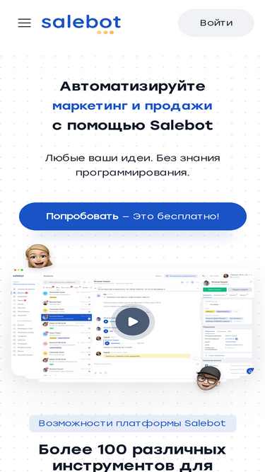 75%SaleBot — платформа, которая поможет вам организовать работу и увеличить прибыль. Сервис позволяет создавать чат-боты, курсы, разрабатывать сайты, а так же осуществлять запись клиентов. Встроенные CRM и аналитика упрощают управление клиентами и автоматизируют бизнес-процессы, что повышает вашу продуктивность.