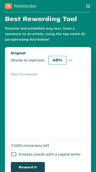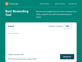 Reword generator helps to reword sentences, paragraphs, articles, and essays to make content unique, engaging, and plagiarism free. Try AI reworder for free now.