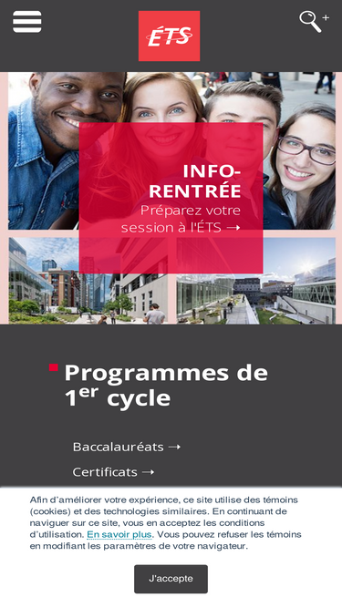 79%Expérience ÉTS L’ÉTS vous permettra de développer un savoir-faire unique, parfaitement adapté pour répondre aux défis technologiques de l’avenir, dans un cadre où les études, l’implication étudiante et le plaisir se côtoient à parts égales. Étudier au Canada Vous étudiez à l’étranger et la perspective de découvrir un autre pays tout en étudiant vous enthousiasme? Vous trouverez ici un excellent point de départ pour vous permettre de concrétiser ce projet formateur...