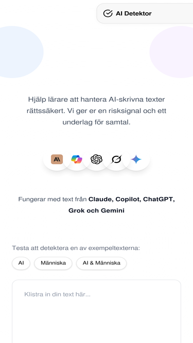 76%Sveriges mest träffsäkra verktyg för att upptäcka AI-genererat innehåll i svenska texter. 99.2% precision för att identifiera texter skrivna av ChatGPT och andra AI-modeller.