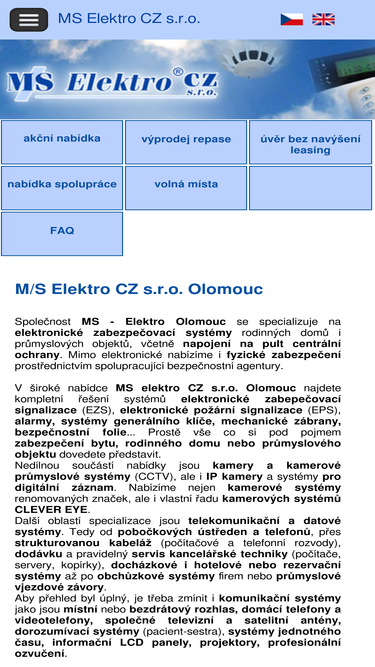 83%m/s elektro cz s.r.o. olomouc se specializuje na elektronické zabezpečovací systémy rodinných domů i průmyslových objektů. nedílnou součástí nabídky jsou kamery a kamerové průmyslové systémy (cctv), ale i ip kamery a systémy pro digitální záznam.