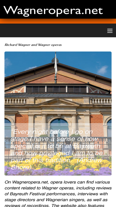 wagneropera.net is a website featuring reviews of richard wagner productions, background articles, and interviews with wagnerian singers, directors, and more.