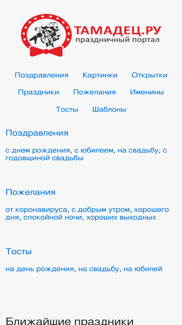 80%Праздничный портал Тамадец.ру - это большая коллекция красивых поздравлений, пожеланий, тостов и открыток к любому празднику.