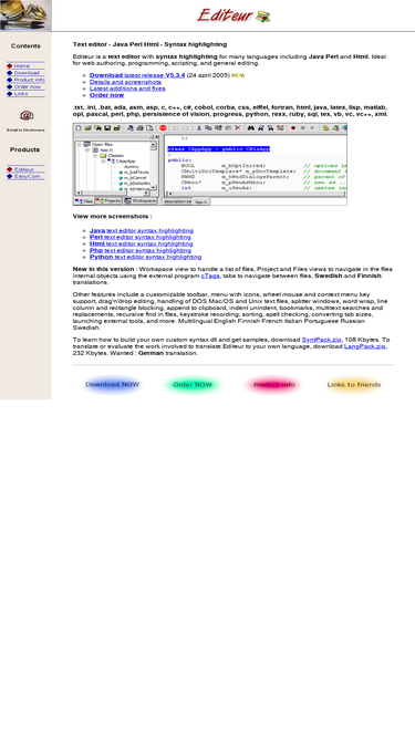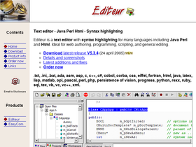 editeur is a text editor with syntax highlighting for many languages including java perl and html. ideal for web authoring, programming, scripting, and general editing.