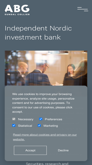 100%ABG Sundal Collier is the independent, Nordic investment banking powerhouse, developed over 30 years, founded on a hard working partnership culture and the ability to attract top talent.