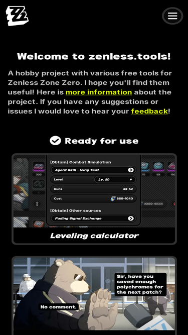 87%Tools for Zenless Zone Zero (ZZZ), an action RPG by HoYoverse. Includes a comic image generator, chat generator, leveling (enhancement) calculator.