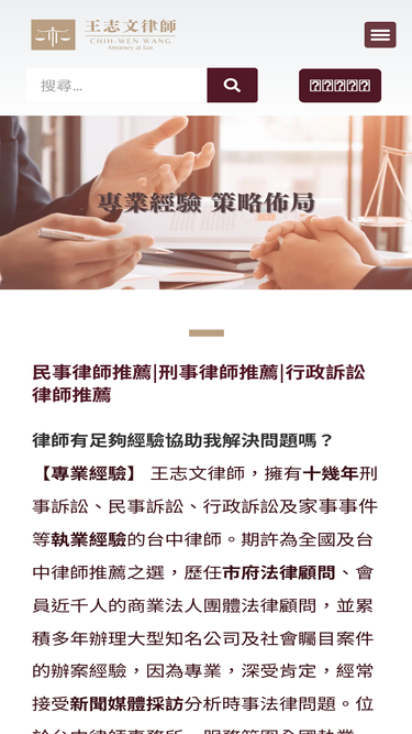 86%王志文律師當選榮任「臺中律師公會副理事長」。|王志文律師擁有十年以上的民事訴訟、刑事訴訟、行政訴訟等執業經驗,亦為多家商業法人團體法律顧問,並有辦理大型知名公司及社會矚目案件之辦案經驗。希望藉由自身多年辦案及法顧經驗,協助每個案件客戶獲得最大權益。