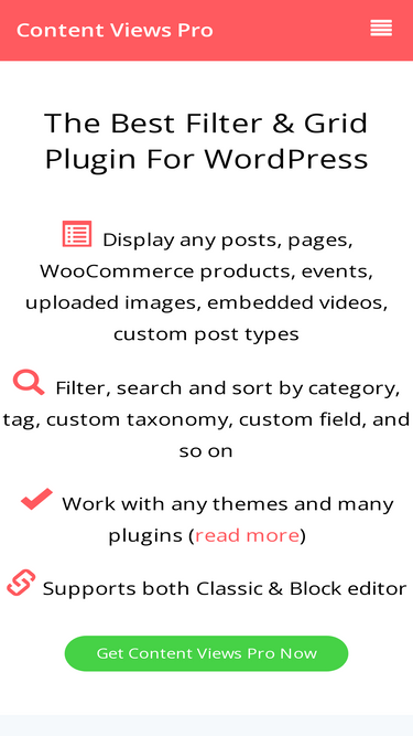 Content Views Pro is the most popular and powerful grid plugin to filter and display any WordPress content in beautiful layouts.