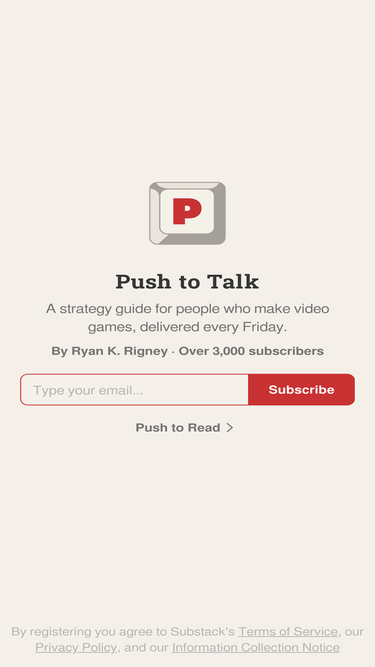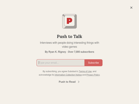 An occasional column about media, gaming, and books by a marketer working in VC. Click to read Push to Talk, by Ryan K. Rigney, a Substack publication with thousands of subscribers.