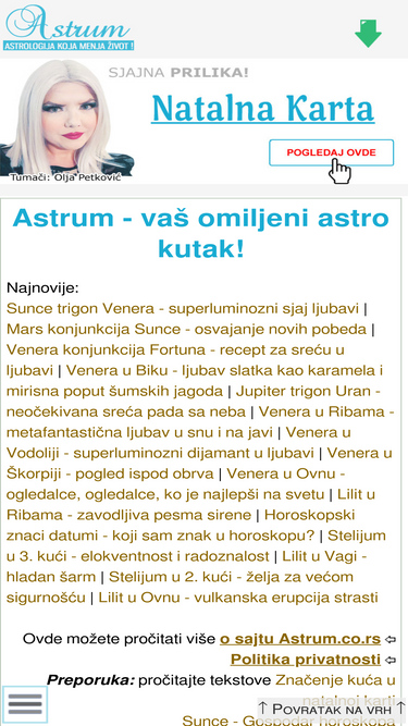 Dnevni Horoskop - Astrologija. Najobimniji astrološki web portal sa preko 2500 tekstova - sve od zabavne do profesionalne astrologije, dnevni horoskop, nedeljni, mesečni, ljubavni, uporedni, godišnji, kineski, majanski, astečka astrologija. Najposećeniji sajt u Srbiji i inostranstvu na temu astrologije.